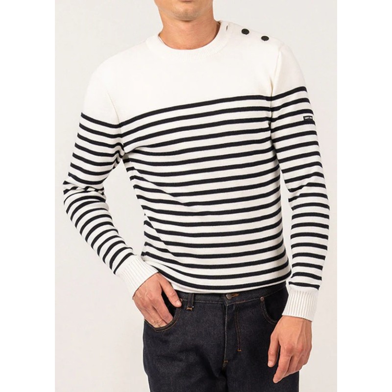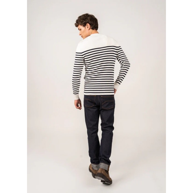 Mit seinen Streifen und der einfarbigen Passe setzt sich die Marine-Identität beim Rochefort-Pullover durch. Der eng anliegende Schnitt und die Schulterknöpfe vervollständigen die Liste der charakteristischen Elemente des Marinepullovers. Auch das Material bricht mit der Tradition: Die Wolle dieses Modells ist weicher als echte Wolle, so dass jeder den Marine-Look tragen kann.