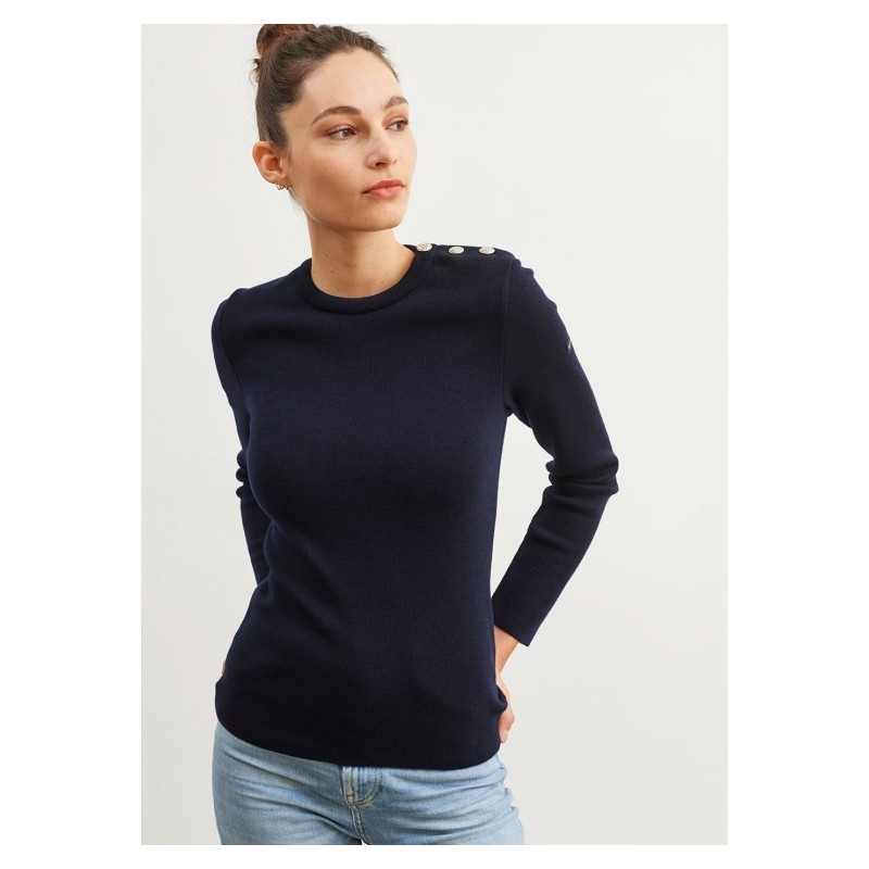 Der von den ikonischen Matrosenpullovern inspirierte Pullover Aix spielt hübsch mit seinen Codes und verdreht sie. Die Streifen erhalten einen Farbtupfer an den Ärmeln, die Knopfleiste ist abgesenkt und wird auf der rechten Seite dupliziert, die kontrastierenden Knöpfe erinnern an die farbigen Streifen...