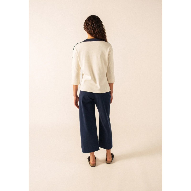 Latsia ist ein Pullover, der von unserer maritimen Welt inspiriert ist. Dieser Wollpullover wird in den französischen Ateliers in Saint-James gestrickt. Dieses feminine Modell verfügt über einen weiten Ausschnitt und Manschetten am Ärmelabschluss.