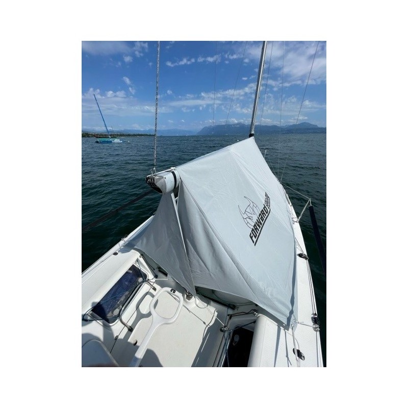 Schutz: Schützt das Cockpit, das Tauwerk und die Ausrüstung vor UV-Strahlen, Exkrementen und neugierigen Blicken. Sparsamkeit: Holzverkleidungen und Taue bleiben länger erhalten. Seitliche Öffnungen für die Wanten und den Mast. Elastische Seitenlaschen, die unter der Leiste festgeklemmt werden, um die Persenning zu halten. Befestigung am Mast durch einen doppelten Gurt. 900 Denier Polyester-Gewebe- Farbe: grau für eine bessere UV-Beständigkeit. 6-Punkt-Zickzack Nähte Garne mit großem Durchmesser, die gegen UV-Strahlen behandelt wurden