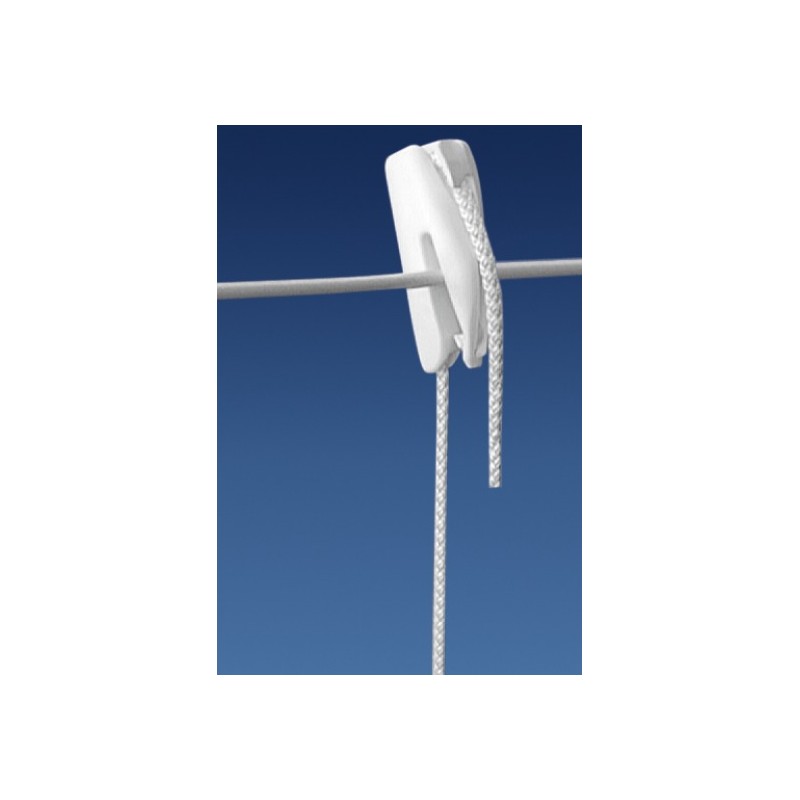 - Maniement d'une seule main !! - Le montage, le réglage en hauteur et en largeur, ainsi que le démontage des pare-battages, sont très simples et rapides. L'autre main est libre pour apporter un soutien éventuel ou pour soutenir les pare-battages restantes. - FEND-FIX est construit de manière à empêcher le glissement vers le côté sur la filière. - Un « talon de blocage » à ressort le maintient solidement en place sur la filière, quelles que soient les conditions. - Convient pour des filières de Ø 4 à 8 mm et des cordes de Ø 4 à 8 mm - Moulé par injection dans un plastique blanc, robuste et résistant aux intempéries. Mesure environ 80 x 30 x 25 mm