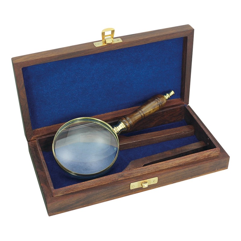 Loupe laiton Ø7.5 cm avec manche et boite en bois