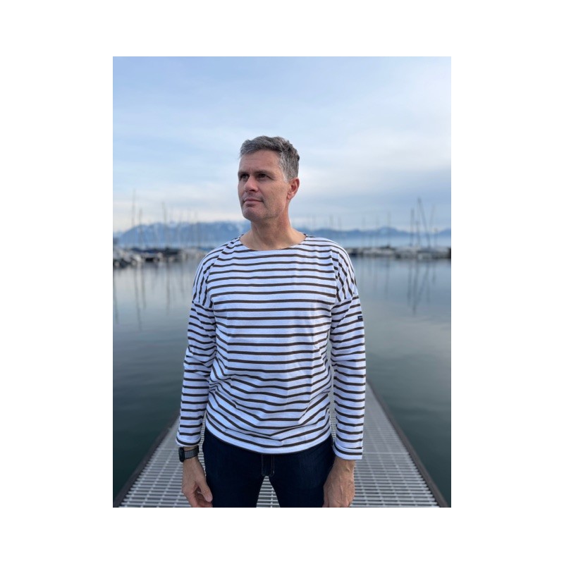 Estivale avec ses manches courtes, la marinière Levant Modern a une connotation balnéaire qui rappelle également que, lors de son institution militaire, il arrivait fréquemment que les marins coupent eux même les manches de leur marinière pour être plus à l'aise.