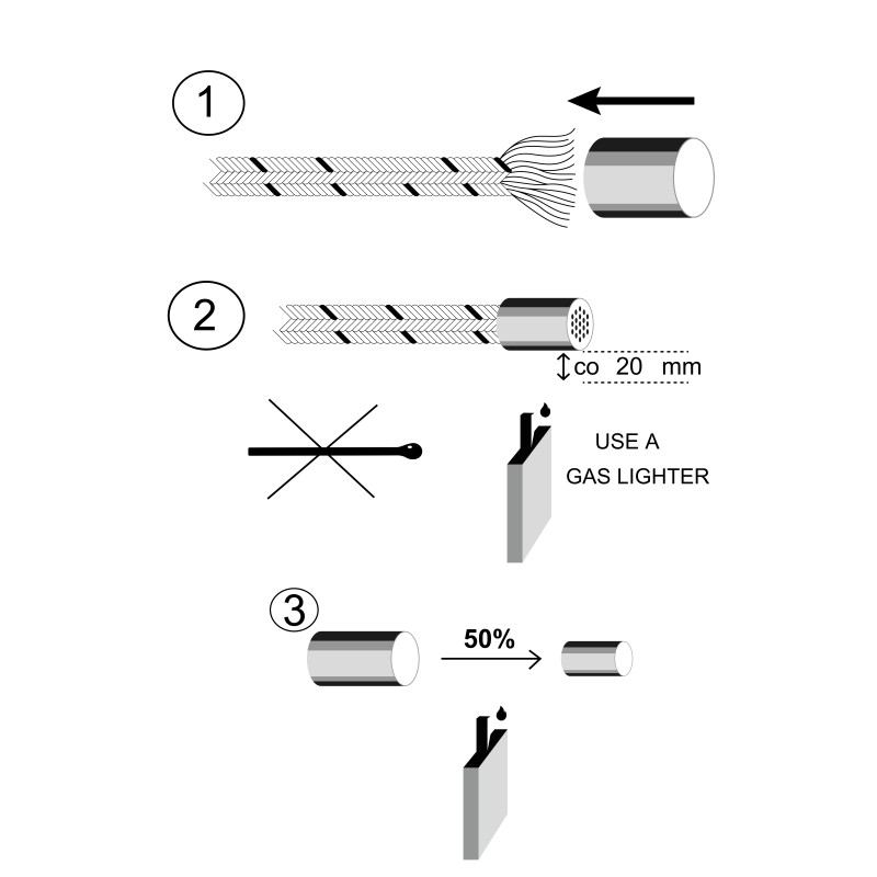 14 housses en plastique résistantes aux UV, en 3 tailles différentes, qui conviennent pour toutes les cordes de Ø 5 à 19 mm Un mode d'emploi simple Ces anneaux en plastique sont simplement tirés par-dessus l'extrémité effilochée du cordage et chauffés avec la flamme d'un briquet. Alors le plastique se rétracte et crée un anneau robuste autour de l'extrémité du cordage.