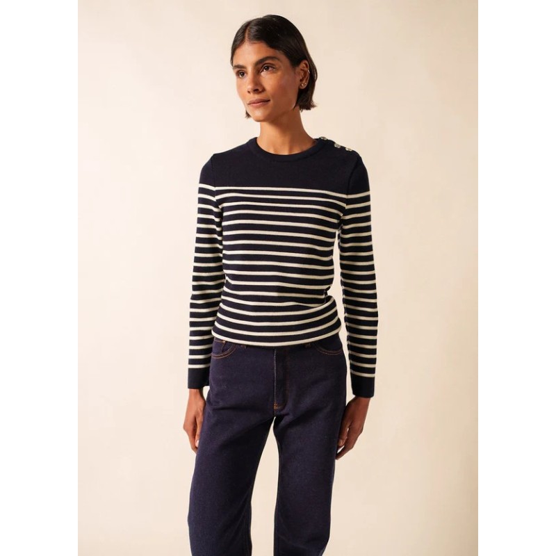 Moins lourd et plus doux que l'authentique pull marin, le pull Marée en conserve les caractéristiques esthétiques : coupe ajustée, col ras du cou et ouverture épaule. Scintillants, les boutons argentés mat sont ornés d'une ancre en relief.