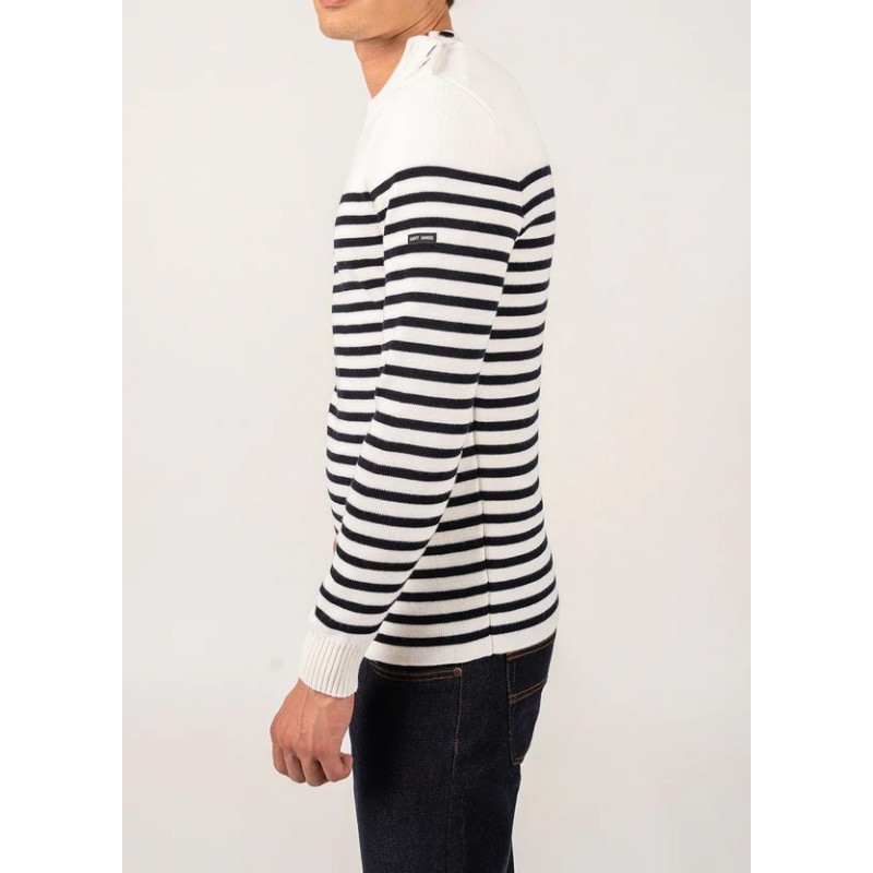Issu de la tradition marine, le pull Binic reprend l'association des rayures et de l'empiècement uni caractéristique des marinières. Tricoté avec la laine historique Saint James, le modèle présente une jolie tenue.