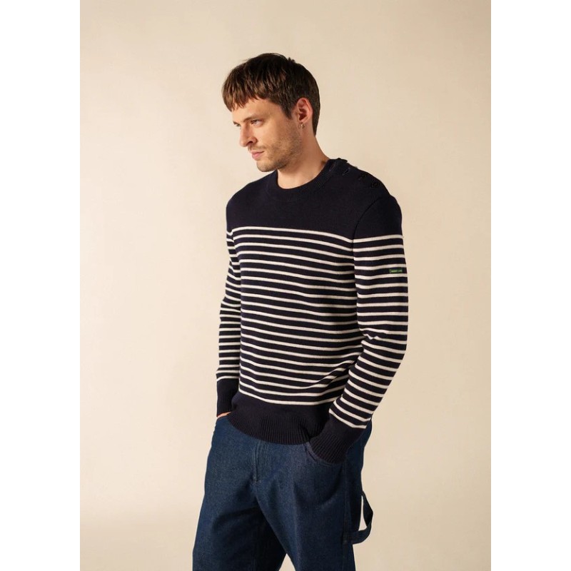 Issu de la tradition marine, le pull Binic reprend l'association des rayures et de l'empiècement uni caractéristique des marinières. Tricoté avec la laine historique Saint James, le modèle présente une jolie tenue.